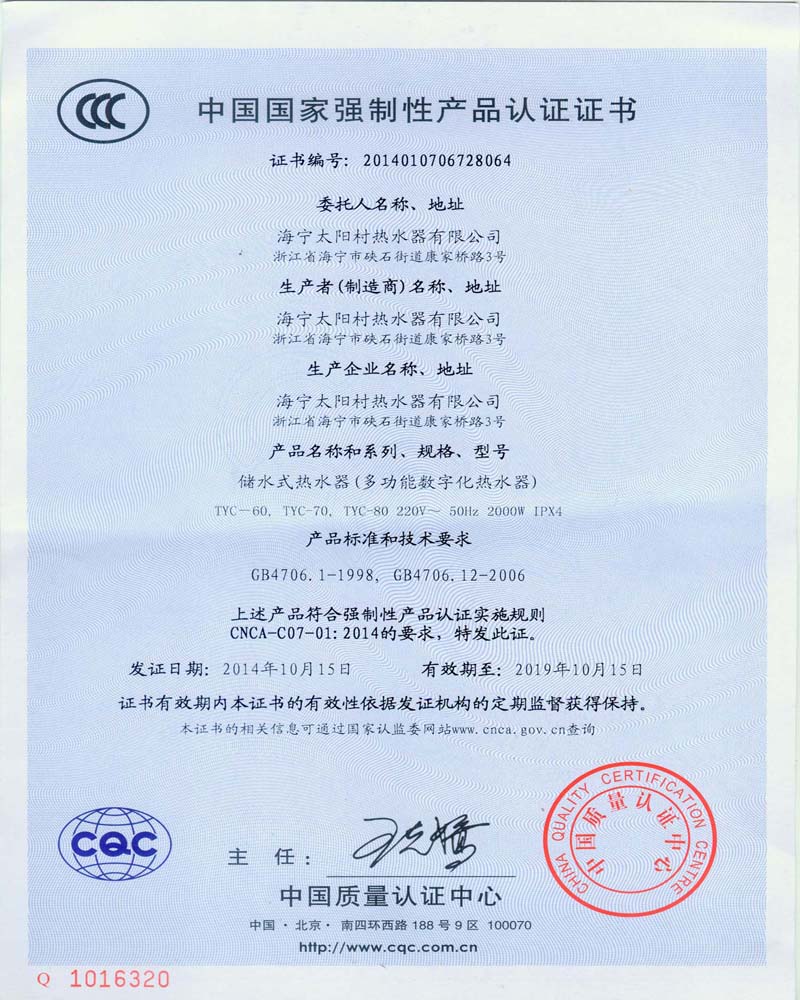 2014年10月15日,海宁太阳村热水器有限公司生产的多功能移动洗澡机成为全国首个通过3C认证的洗澡机产品。